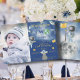 Adorável convite de Aniversário do bebê com astronauta, foguetes, Terra e estrelas sobre fundo azul escuro. Sacudir o nosso convite para ver uma estrela cadente de volta. Visite nosso compro para toda a nossa linha, incluindo fralda correspondente e cartões de livro.