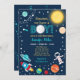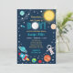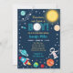 Este belo convite apresenta um astronauta, um foguete, um sol e um fundo estelar.