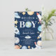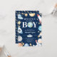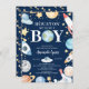 Adorável convite de chá para bebês com astronauta, foguetes, planetas e estrelas sobre fundo azul escuro. Sacudir o nosso convite para ver uma estrela cadente de volta. Visite nosso compro para toda a nossa linha, incluindo fralda correspondente e cartões de livro.