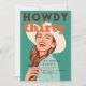 Um modelo convite de festas divertido para mulheres com um tema ocidental retrógrado, com um esboço ao estilo poster de uma bela mulher vestindo um chapéu de vaquinha, em uma pose suja, com o título "howdy 30", com um esquema de cores laranja, teal e terracota. Uma aniversário de 30 anos divertida convidada para uma mulher no seu trigésimo aniversário.