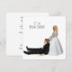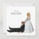 Noiva arrastando o noivo pelo colarinho em fundo branco para convite para chá de panela.