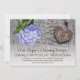 Hydrangea azul e coração metálico enferrujado com monograma no convite para casamento rústico de madeira apresentando um coração metálico castanho enferrujado com iniciais pregadas no conselho de madeira de cinza e uma flor azul de hydrangea.