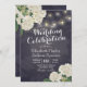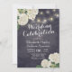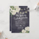 Modelo de Cartões de Convite para Celebração de Casamento - Flores de Hydrangea Brancas Elegantes e Luzes de Cordas no Fundo de Linhagens Florais Azuis de Marinho Vintage. Um Design perfeito para o seu grande dia. Todo estilo de texto, cores, tamanhos podem ser modificados para ajustado das suas necessidades!