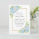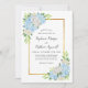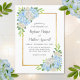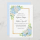 Estes convites para o casamento apresentam um design floral moderno com flores azuis de hydrangea, folhas de rosas brancas, folhagem e uma falsa borda de ouro. Personalize-os com o seu próprio texto.