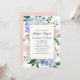 Convide familiares e amigos para o seu evento com este convite de aniversário de casamento floral. Apresenta ilustrações em aquarela de hífenes azuis, rosas cor-de-rosa pinceladas, eucalipto e verde com estrutura falsa em folha de ouro. Personalize adicionando detalhes de evento, nome, hora, data, local e outros eventos. Você também pode mudar a imagem traseira para uma foto ou qualquer outra imagem. Este convite floral é perfeito para os aniversários de casamento de jardim e primavera.