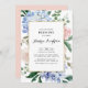 Convide a família e os amigos para o seu evento com este elegante convite de bênção floral. Apresenta ilustrações em aquarela de hífenes azuis, rosas cor-de-rosa pinceladas, eucalipto e verde com estrutura falsa em folha de ouro. Personalize adicionando detalhes de evento, nome, hora, data, local e outros eventos. Você também pode mudar a imagem traseira para uma foto ou qualquer outra imagem. Este convite floral é perfeito para bênçãos de jardim e primavera.