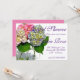Este romântico floral rosa e roxo em mason jar - Chá de panela - é perfeito para qualquer casamento formal, botânico, floral, romântico, ao ar livre, rústico, vintage. É uma excelente escolha para qualquer primavera ou noiva de verão. Torne-o facilmente seu, selecionando Personalizar este modelo e digitando suas informações. Em segundos você verá seus convites únicos e incríveis! Hídranga rosa chocante do meu jardim!
