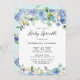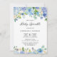 Convide a família e os amigos para o seu evento com este convite para o chá de aspersão de bebê floral azul. Apresenta ilustrações de aquarelas de drangeas azuis, rosas e peônias, rosas brancas, anêmonas brancas, verde e padrão floral correspondente. A paleta colorida deste convite floral hipnórdico é perfeita para chás de fraldas de primavera e inverno. Personalize adicionando nomes, data, hora, local e outros detalhes do evento. Altere o padrão floral para uma foto ou qualquer outra imagem.