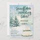 Belo e encantador chá de panela de inverno com uma escrita manual moderna, flocos de neve, bolo de casamento, vergreens e neve em tons de lacre, azul legal e branco. Disponível como download digital ou impresso. Design por LeahG de budgetweddinginvites.com