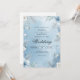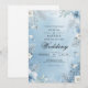 A serene, cool-toned floral arrangement frames a soft, atmospheric blue background. Hints of white blossoms and frosted foliage evoke a gentle, elegant, and tranquil mood.