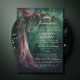 Uma ilustração com uma aquarela branca de uma árvore majestosa, com folhagem e detalhes florais exuberantes em verde esmeralda e mauve, com um véu rosa mauve feminino cortado sobre um galho, brilhante com luzes de fadas e poeira mágica, decora este verão primavera de outono de inverno o convite da Quinceañera com um tema de floresta encantado. Um convite elegante e moderno para um conto de fadas Quinceañera. Perfeito para raparigas e famílias que adoram o cenário florestal de conto de fadas, o tema da floresta de fadas ou do jardim de fadas e o verde esmeralda, o mauve e o ouro.