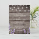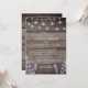 Convite de casamento com impressão em madeira rústica com lavanda e luzes de corda brancas com código QR no verso para responder.