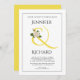 Amante elegante e rosa branca iluminando o convite de casamento virtual amarelo. Inclui uma elegante e em amarelo iluminante, o texto "O AMOR NÃO É CANCELADO", uma rosa branca e seus nomes e detalhes.