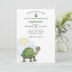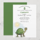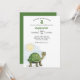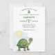 Este convite de festa personalizado apresenta uma ilustração de um bebê tartaruga fofo. Uma pequena tartaruga verde é colocada no canto inferior esquerdo com um sol brilhando sobre ela. É bom para um chá de bebê ou festa de aniversário infantil. O nome e a idade de exemplo são impressos em uma fonte verde.