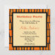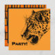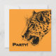 Convite de aniversário. Um desenho realista de leopardo preto e amarelo. Legal manchas pretas com sua boca aberta e rugindo, mostrando seus dentes pontiagudos. Excelente para uma festa selvagem. Na parte de trás está um padrão tribal em laranja e preto. Insira os detalhes de sua parte na caixa bege com uma borda preta.