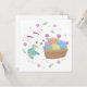 Uma ilustração fofa de um coelho segurando um ovo de Páscoa na frente de uma cesta cheia de ovos de Páscoa coloridos
