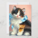 Cartão com um gatinho calico fofo. O gatinho veste uma fita azul enquanto se senta adoravelmente em uma mesa. Um presente perfeito para amantes de gatos e entusiastas de arte vitorianos!