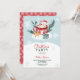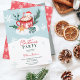 Um convite de festas de Natal moderno, fofo e caprichoso, com um bonitinho bonitinho a flutuar numa taça quente de chocolate segurando uma bengala vermelha e branca com árvores de Natal brancas e vermelhas e nevando na taça com um presente fofo azul embrulhado numa pilha de neve com uma estrela de ouro bege biscoito. Uma festa tradicional de Natal vermelha e verde com uma fonte divertida de script escovado. Todas as cores são editáveis.