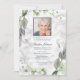 Um belo funeral ou um convite para o memorial com uma fotografia do falecido, decorada com um belo verde de aquarela que desaparece num fundo falso de mármore da carrera. A parte traseira da placa apresenta uma textura verde de traçado de aquarela. Copyright Elegant Invites, todos os direitos reservados.