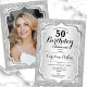 Elegante convite de 50 anos femininos com sua foto na parte de trás do cartão. Design com falso brilho de prata. Possui faixas prateadas, fonte de script e confetti. Perfeito para uma festa de comemoração de na moda adulto. Personalize com seus próprios detalhes. Pode ser personalizado para qualquer idade! Impressos convites Zazzle ou modelo de impressão digital instantânea para download.