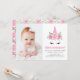 Convide convidados para o primeiro aniversário do seu bebê com este belo e feminino primeiro convite de aniversário. Ele apresenta um unicórnio cor-de-rosa com peônias cor-de-rosa e um padrão de peônias correspondente. Este bonito convite para o primeiro aniversário da foto unicórnio é perfeito para festas de aniversário de primavera e jardim.