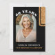 Imagem Dourada e brilhante surpresa de 60º Aniversário. Design moderno com falso brilho dourado sobre fundo preto com nome personalizado e uma foto em um quadro de arco na frente. Personalize o convite na frente e no verso.