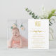 Um convite ao batismo religioso clássico e elegante para bebês que apresenta caligrafia moderna, uma pomba branca coberta de ouro que carregar uma cruz branca. Sexo neutro, batizante de menino ou menina. Modelos para a foto e todo o texto.