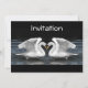 Uma fotografia da natureza foi aumentada digital para criar uma imagem invertida de uma cisne branca muda. Há uma forma do coração criada onde as duas cisnes se encontram. A cisne branca está contra as ondinhas na água azul e em um fundo preto.