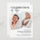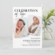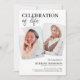 Elegantes convites fúnebres em memória, com um simples fundo branco, duas fotos da pessoa que faleceu, o título 'comemoração da vida' e os detalhes do funeral.