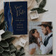 Este elegante e moderno salve a placa de data apresenta um marinho azul de aquarela agata borda cortada com falso brilho dourado. O texto dourado aparece sobre um fundo azul marinho. Substitua facilmente a imagem de amostra no verso por uma foto vertical da futura noiva e noiva.