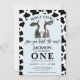 Impressão Azul Arca Negra primeiro aniversario de Vaca Santa Convite Estudo O tema da vaca doce Primeiro convite de aniversário com um arco azul claro e um padrão de impressão de vaca negras. Esse convite de primeiro aniversario de vaca sagrada, bonito, apresenta uma vaca negra e branca e é ideal para quem procura um design de convite preto e branco.