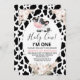 Impressão de vaca branca negra Santa Vaca Aniversário Convite Santa Vaca Sagrada Vaca sagrada Feliz Convite para o aniversário de uma menina no estilo boêmio com uma vaca branca e negra fofa, um arranjo floral de bolo doce com grama-palha, pomares brancos e um fundo de cobertura preto. Este design é adequado para qualquer idade.