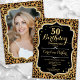 Elegante convite de 50 anos femininos com sua foto na parte de trás do cartão. Design preto de vidro com impressão de leopardo animal e ouro brilhante falso. Possui fonte de script e confetti. Perfeito para uma festa de comemoração de na moda adulto. Personalize com seus próprios detalhes. Pode ser personalizado para qualquer idade! Impressos convites Zazzle ou modelo de impressão digital instantânea para download.
