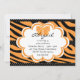 Este convite de aniversário apresenta um impressão de tigre laranja e preto e bolinhas pretas e brancas.