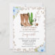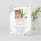 Impressão de Vaca Floral Azul Pequeno Convite para chá de fraldas de Vaquinha Pequeno Vaqueiro Está no caminho do convite para chá de fraldas com duas botas de vaqueiro, alguns cactos, touro e crachá do xerife. Este convite para chá de fraldas do menino temático cowboy também apresenta algumas disposições florais azuis e um padrão de impressão de vaca colorida para cinza.