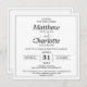 Roteiro elegante convite físico ou digital impresso em branco com letras pretas e um quadro delicado. Personalize-o com os nomes, apelidos, data, local, registro e RSVP do Sr. e Sra. A parte traseira pode ser personalizada com as iniciais do casal.