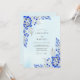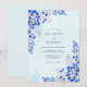 This design features cascading clusters of vibrant blue blossoms that create a sense of movement and grace. Soft silver-gray leaves complement the deep indigo tones, set against a light-filled backdrop. Perfect for a seasonal event, the artwork evokes the fresh and airy feel of a clear sky in bloom. Specific floral elements resemble delicate wisteria or delphinium clusters.