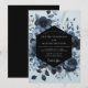 Experience a moody and romantic ambiance with this stunning floral design. Lush indigo, slate blue, and dusty blue watercolor blossoms create a captivating arrangement. The detailed painting showcases large anemones and delicate roses, surrounded by ethereal grey foliage. This dramatic and elegant composition sets a sophisticated tone for your special day.