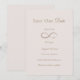 Este lindo convite de Salve a Data do Casamento apresenta o clássico sinal de infinito para unir os nomes da noiva e do noivo, simbolizando amor eterno. A cor do fundo foi definida como rosa claro, mas sinta-se à vontade para alterá-la para uma cor diferente para combinar com o tema do seu casamento.