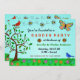Jogue uma festa do jardim de verão divertida com estes convites bonitos e caprichosos. Estes convites bonito mostram uma cena de flor e árvore num fundo azul-céu, completo com um cardeal vermelho, um pássaro azul, abelhas zunindo pelo ar, uma borboleta colorida voando e dois joanheiros laranja. A parte de trás repete o design com uma joaninha vermelha.