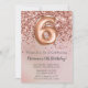 Convite de aniversário rosa de ouro elegante para uma menina de 6 anos com roteiro elegante escrevendo com fonte preta e balões de folha divertida.