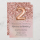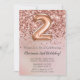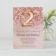 Convite de festas elegante rosa de segundo aniversário de ouro para uma menina de 2 anos com roteiro elegante escrevendo com fonte preta e balões de folha divertida.