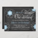 Um convite de aniversário temático do one-derland adorável do inverno. Mostrado no quadro, no azul e no branco cinzentos. Personalize facilmente para seu partido!