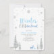 Celebre seu dia especial com este convite de aniversário de 1 ano moderno Winter Onederland! Este design apresenta uma cena de inverno com flocos de neve prateados, árvores, cervos e tipografia estilosa "Winter ONEderland" em tons de azul e prata. Convite perfeito para uma festa de primeiro aniversário com tema de inverno.