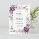 Elegante convite para o casamento floral no meio do verão com peônias de rosas de aquarelas em tons de ameixa roxa, rosa poeirento, rosa poeirento, mauve, sábio com folhas botânicas verdes e eucalipto com estrutura geométrica dourada. Entre em contato conosco para obter mais detalhes sobre a personalização ou os itens correspondentes.