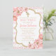 Una invitación simples y delicada para la Primera Comunión, el Bautismo o el Bautizo de su hija con Flores de color rosado y una cruz de color oro. Los detalhes, os fáciles de cambiar para adaptarlos a su evento. Los artículos a juego para esta colección se pueden nuestra tienda .