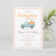 Featuring a cute blue truck filled with pumpkins, warm neutral gingham border, and elegant autumn tones — perfect for a baby boy’s fall celebration.