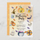 This Halloween invitation features a watercolor-style layout with various themed illustrations, including a carved pumpkin at the top, candy pieces, bats, a potion bottle, skulls, a ghost, a cauldron, and other classic Halloween icons arranged around the text area. The center section contains customizable event details such as date, time, location, and RSVP information, all set against a light textured background that highlights the artwork.
