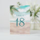 Cena de praia pintada por brisa de ilha, com Ondas de Oceano, praia de Sandy e Palm Trees, com um belo céu azul-lacrimogênio. Com Fontes Modernas De Script De Tipografia. Uma Praia Tropical de Verão, Ou design de casamento de destino - Cartão de Local de Número de Tabela de Convidados de Recepção de casamento Personalizada! Veja meu compro para ver a suíte de casamento inteira para este design!