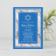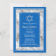Convite de papel para Bar Mitzvah com textura de mármore azul e branco com a bandeira de Israel, apresentando a Estrela de Davi e o nome hebraico do seu filho. O símbolo da Estrela de Davi pode ser removido na ferramenta de design da Zazzle, se desejar. As cores neste convite tradicional de Bar Mitzvah são azul Israel, cinza prateado e branco. São cores clássicas e elegantes, sofisticadas e sempre estilosas. Embora este convite seja personalizado para um Bar Mitzvah, pode ser usado para diversas ocasiões especiais judaicas... depende de você. Tudo o que precisa fazer é alterar o texto e possivelmente remover a Estrela de Davi. A cor azul também é totalmente editável neste convite usando a ferramenta de design. Você também pode substituir a textura de mármore por qualquer imagem que preferir. Adicione texto no verso, se desejar, usando